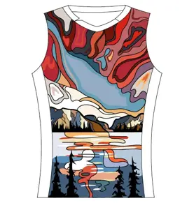 Maintaining a connection to the land is not only Important to my family but to indigenous peoples all over Canada. The land relates to all aspects of life, and environmental health has continually been a vital component of the overall health and well-being of First Nations. The sky, water, and earth have always been intertwined with indigenous sovereignty, spirituality, and way of life. For those reasons, I decided to create a landscape for each of the jerseys; with one dedicated to fire tones, water tones, and earth tones I wanted to show my deep appreciation for the land we reside on and the beauty within it.